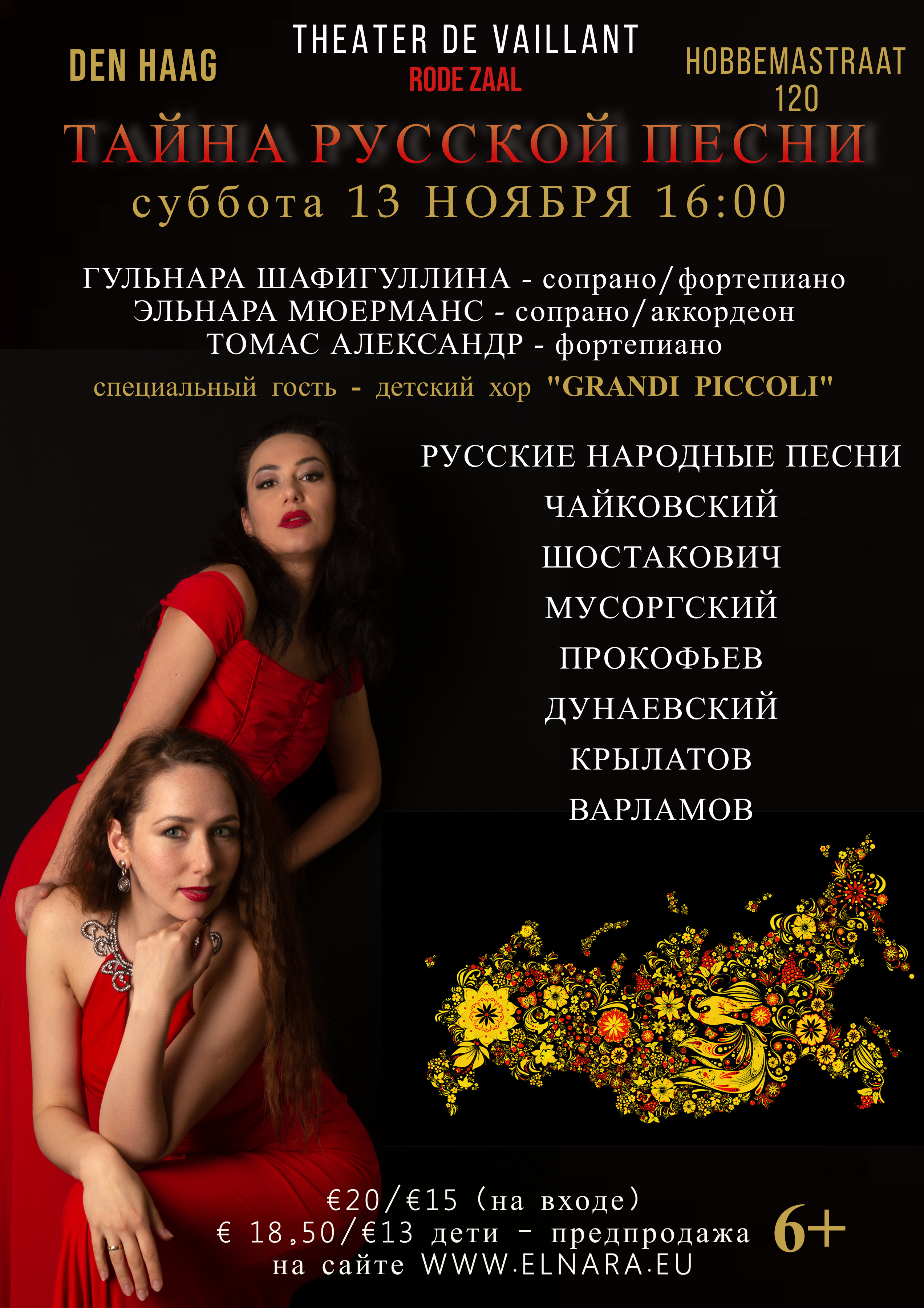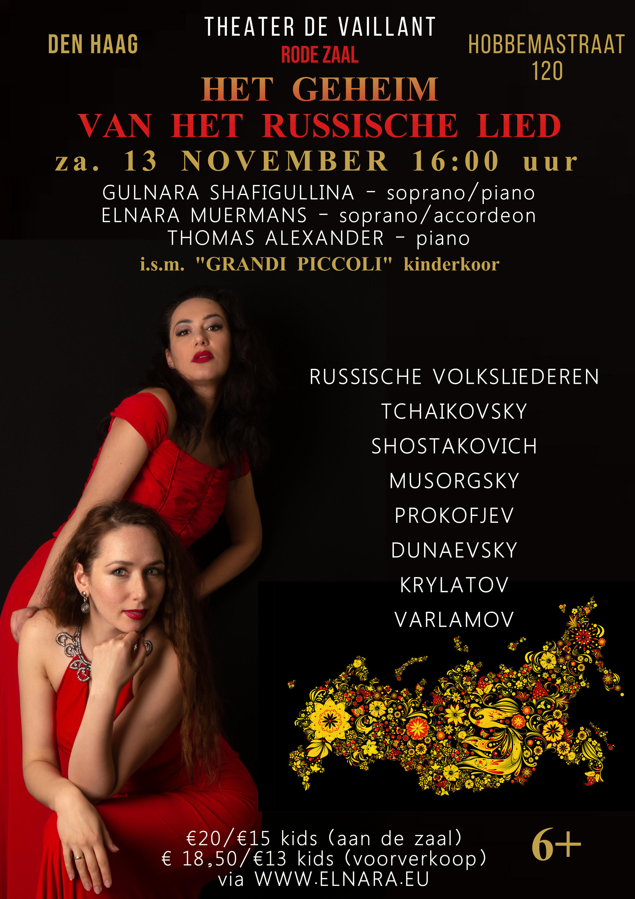 In het theater De Vaillant in Den Haag zullen Elnara en Gulnara een afwisselend programma vol met warmbloedige Russische liederen ten gehore brengen. Grote meesters en oer oude Russische volkeren komen tot leven door de formidabele stemmen van de mooie zussen!