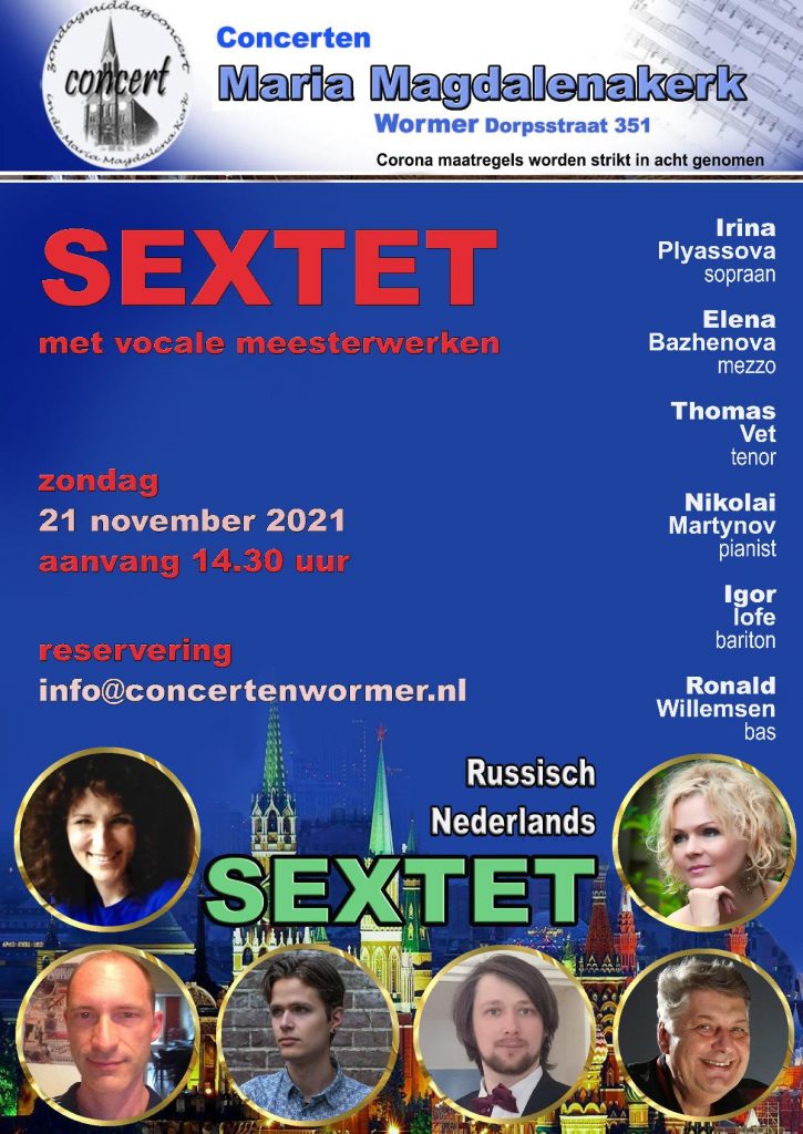 De mooiste en meest beroemde vocale werken gezongen door het Russisch-Nederlands Vocaal Sextet (zie het programma onder de tekst). Irina Plyassova, Elena Bazhenova, Thomas Vets, Igor Iofe en Ronald Willemsen. De jonge Russische meesterpianist Nikolai Martynov zal ons begeleiden. Na het behalen van zijn master uitvoerend musicus in Moskou behaalde hij aan het Conservatorium in Amsterdam een 2de master echter nu gericht op het spelen van oude instrumenten. Deze studie is net afgerond en in november gaat dit super talent weer terug naar Moskou.