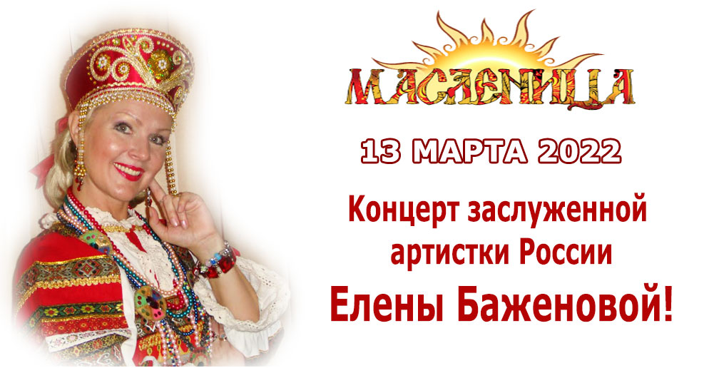 В воскресение 13 Марта 2022 года в 17:00 состоится концерт заслуженной артистки России Елены Баженовой «Эх, Масленица!».