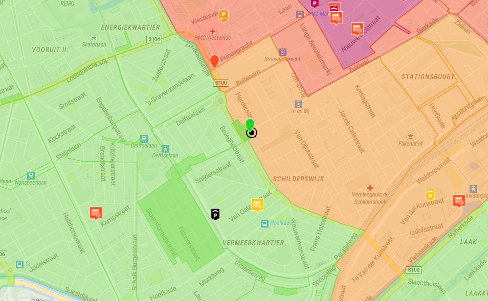 Но на улицах напротив (смотрите карту выделенную зелёным), парковка бесплатная до 18:00