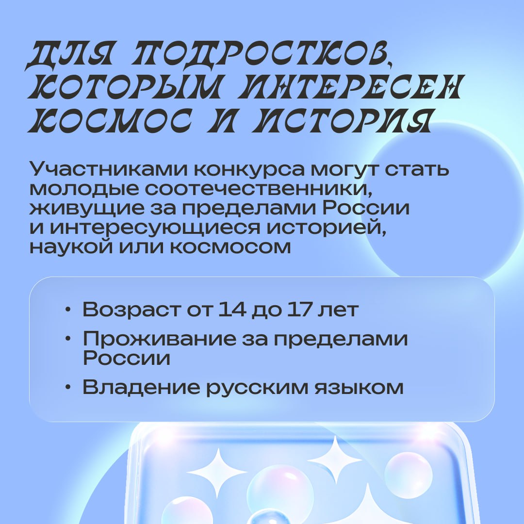 💡 Если тебе 14–17 лет, ты владеешь русским языком, живёшь за пределами России и интересуешься историей, наукой и космосом, то у тебя есть шанс стать частью международного исторического конкурса «Первый в космосе»