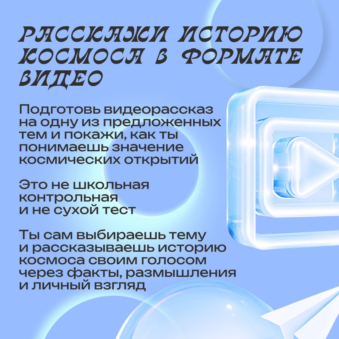 ✨ Полёт Юрия Гагарина – это история о смелости, науке и вере в будущее. Твоя история тоже может быть услышана. Космос начинается с мечты, а история с тех, кто готов её изучать и рассказывать дальше!