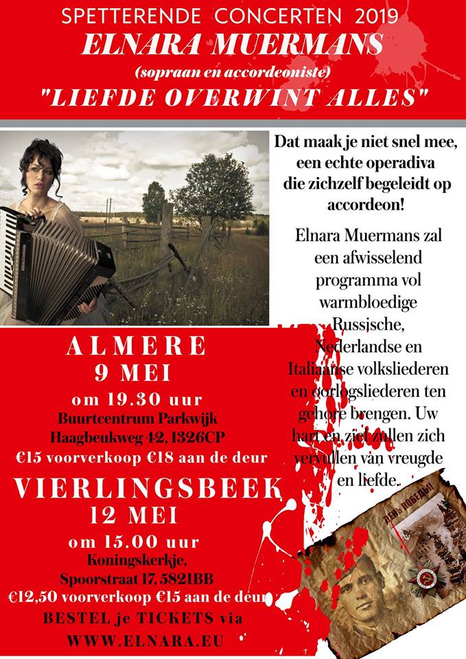 Дорогие друзья, уже в четверг, 9 мая в Алмере вас ждёт тёплый музыкальный вечер, посвящённый Великому Дню Победы. В программе русские, итальянские голландские народные и военные песни. Также произойдёт награждение рисунков, участвовавших в конкурсе «Любовь побеждает всё!». Приходите всей семьей!