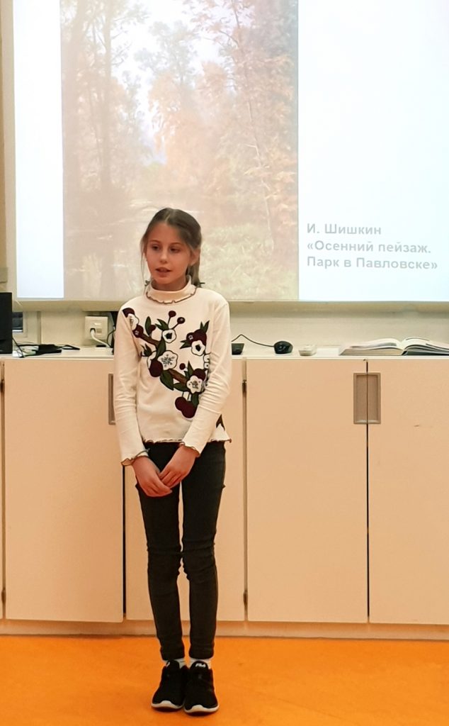 Одна за другой представали картины И.И. Левитана, В.Д. Поленова, И.И. Шишкина, Е.Е. Волкова, И.С. Остроухова. Школьники с интересом подбирали картины к исполняемым стихотворениям.