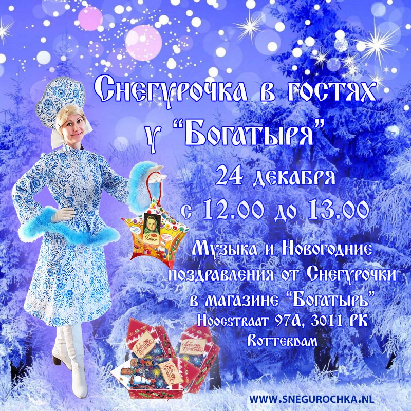 Дорогие друзья! Приходите в гости ! 24 декабря с 12.00 до 13.00 Снегурочка будет в гостях у Богатыря! По адресу: Hoogstraat 97A, 3011 PK Rotterdam Музыка, песни и сюрпризы!