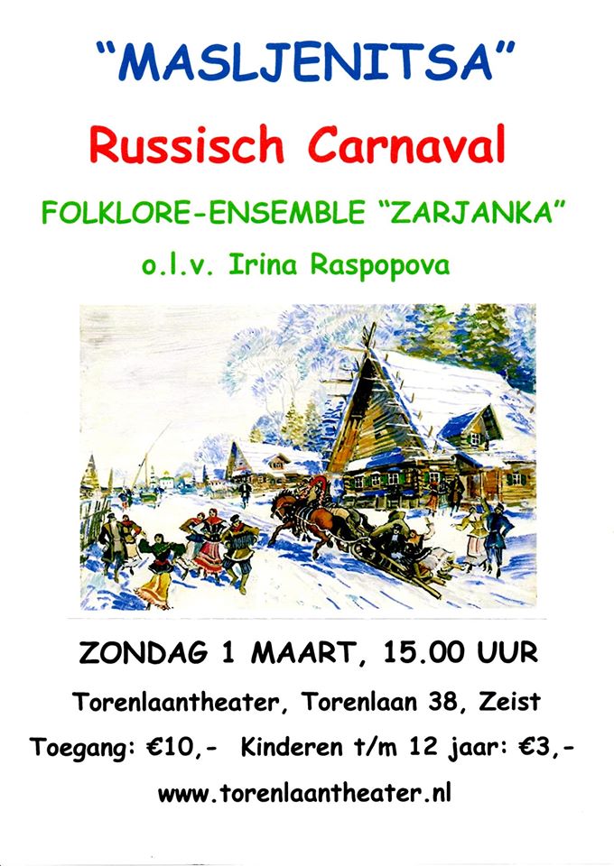 Kom naar ons RUSSISCHE CARNAVAL: MASLJENUTSA — de pannenkoekenweek op 1 maart. Dat vieren wij op 1 maart om 15.00u in het Torenlaan theater in Zeist. Het adres is Torenlaan 38, 3701 VK Zeist.