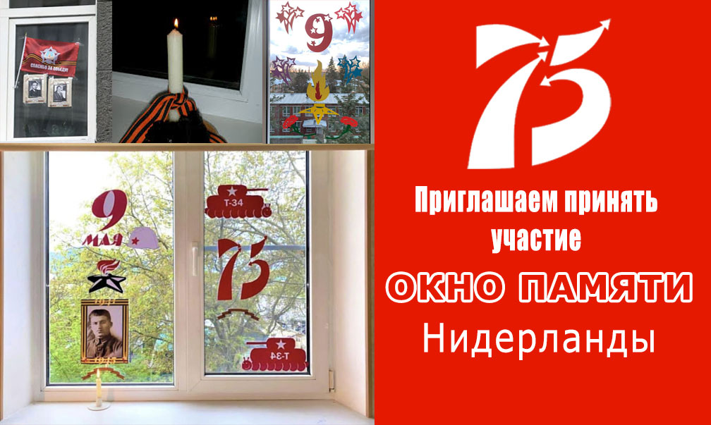 Вы можете принять участие в акции «Окно Памяти-Нидерланды», украсив окна своих квартир и домов: символами Великой Победы; портретами Ваших Ветеранов, георгиевскими лентами, красными звездами, словами благодарности в адрес ветеранов, вечером зажечь в своём окне «Свечу Памяти»!