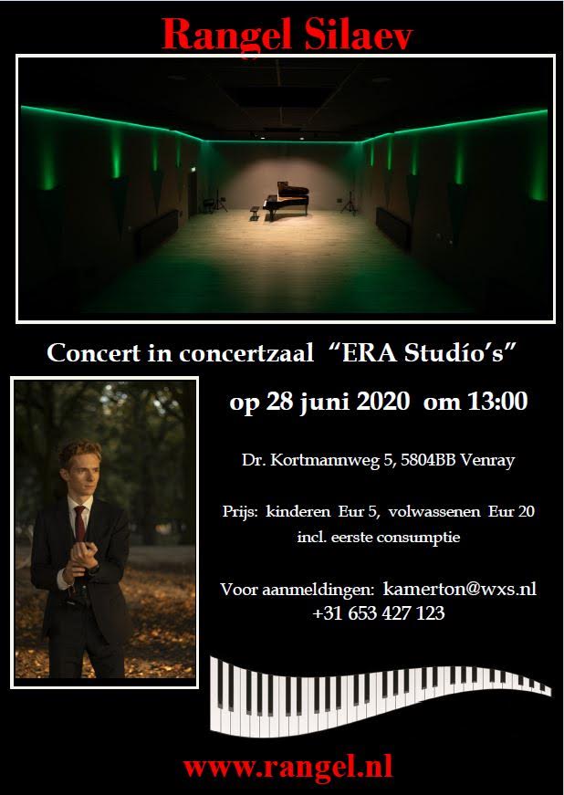 28 июня Рэнджел исполнит особый концерт, представив публике свою разностороннюю творческую личность и показав возможности своего нового концертного зала / студии. Половина концерта – исполнение классических произведений Рахманинова, Скрябина, Прокофьева, Шостаковича на рояле Steinway. Вторая часть программы будет дополнена собственными композициями Рэнджела, в том числе и инновационной музыкой для фильмов с исполнением на рояле и других инструментах. На концерт имеется ограниченное количество мест, в случае заинтересованности резервируйте билеты как можно скорее (на русском) через kamerton@wxs.nl, т. +31653427123 или на сайте зала https://www.eventbrite.com/e/e
