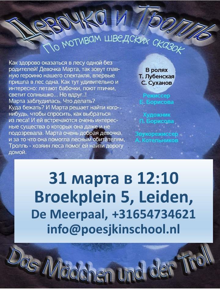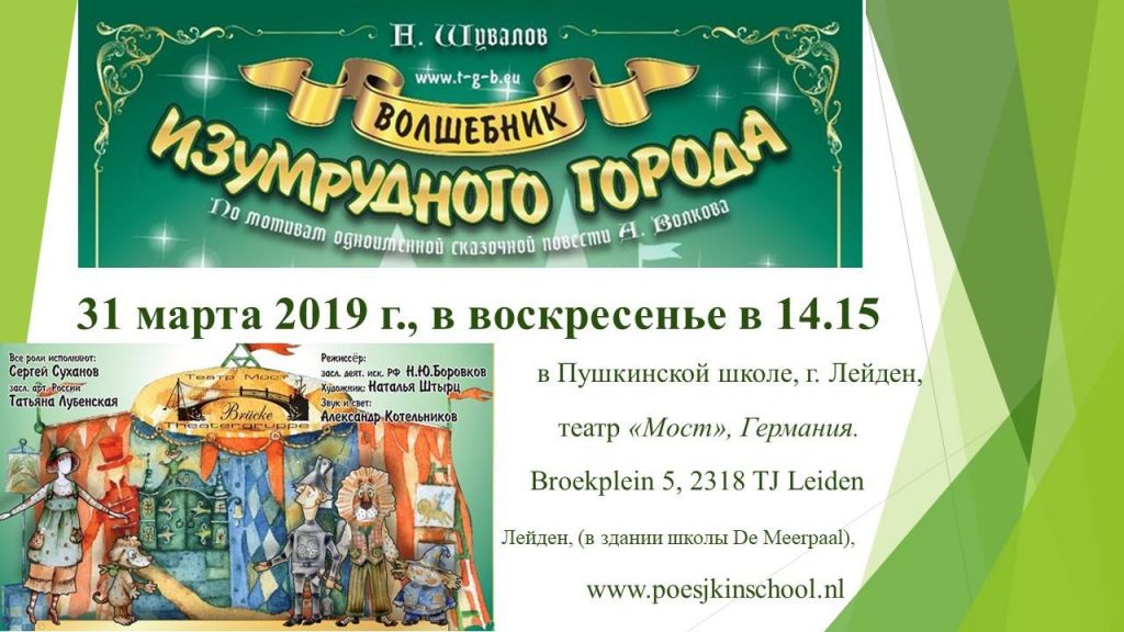 Пушкинская школа приглашает Вас 31 марта (в воскресенье) на спектакли театра «Мост», Германия. Начало спектакля «Девочка и тролль» в 12:10 и спектакля «Волшебник изумрудного города» в 14:15.