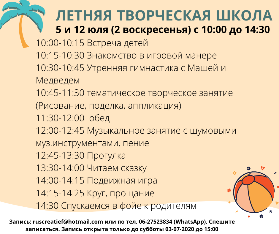 Летняя школа работает 5 и 12 июля, то есть 2 воскресенья с 10:00 до 14:30 ( все возрастные группы кроме раннего развития, где занятия 1.5 часа в день).
