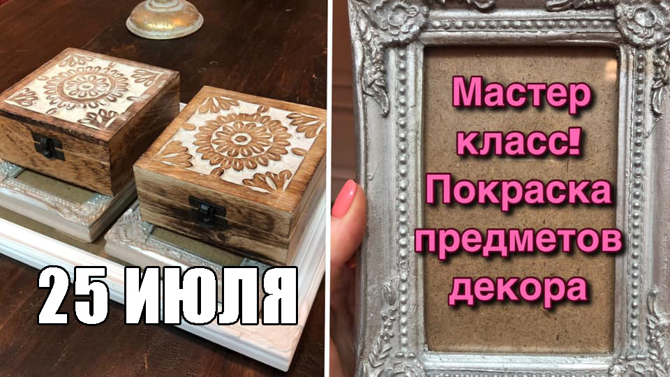 Это будет 3х-часовой воркшоп с небольшими предметами декора — шкатулки, фоторамки, подсвечники. На них мы отработаем такие же техники как на 2х-дневном воркшопе, только в маленьком масштабе. Вы научитесь техникам, с помощью которых дома вы сможете красить мебель.