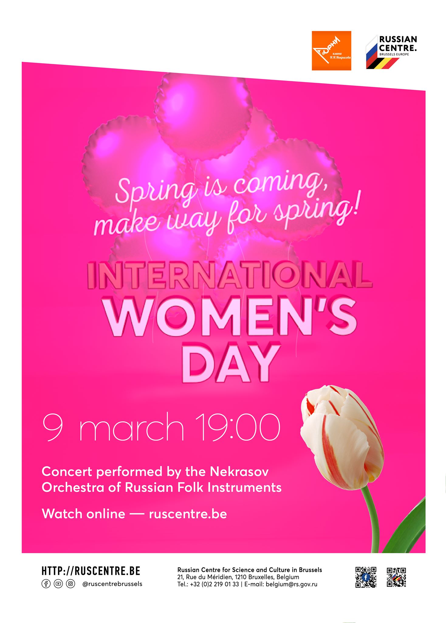 Поздравляем с прекрасным весенним праздником всех женщин во всём мире, и желаем им здоровья, счастья, радости и процветания! В этот замечательный весенний день Академический оркестр русских народных инструментов имени Н. Н. Некрасова спешит подарить вам праздничное настроение. В программе этого выступления русская народная музыка, песни и русские романсы в исполнении выдающихся российских певцов и инструменталистов.